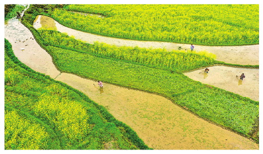 ▲春日里,铜仁市玉屏侗族自治县亚鱼乡郭家湾村的农民在田间劳作(无人机照片)。 新华社发(胡攀学摄)