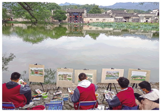 ▲在宏村南湖,学生们正画着眼前的风景。 黄西蒙摄