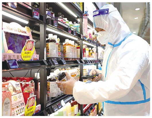 图4:4月15日,来自武汉的何勇在上海盒马鲜生(宝地店)核对商品库存。