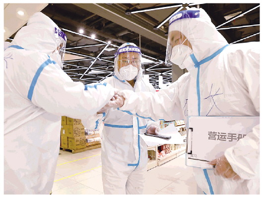 图1:4月15日,上海盒马鲜生(宝地店)店长袁亮(右)与来自武汉的杜顺(中)交接完工作后互相加油。