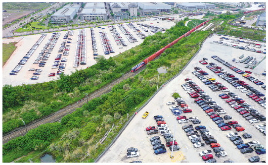 四月十四日,长城汽车专列首发列车行驶在重庆永川国家高新区铁路专用线上。