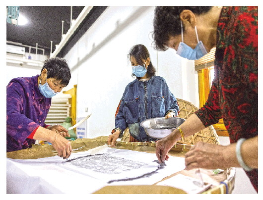 ▲用鹅毛将蚕种铺匀。 |