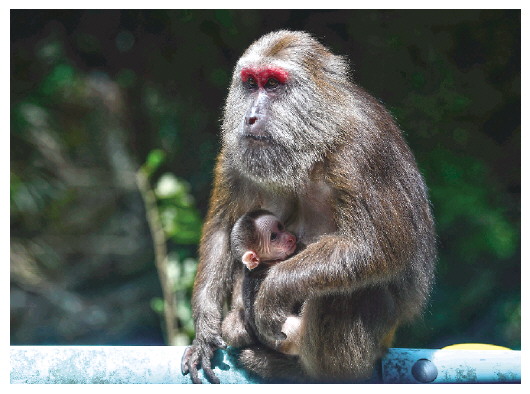 4月21日在贵州梵净山国家级自然保护区管理局印江县紫薇镇管理总站附近栖息的藏酋猴及幼崽。