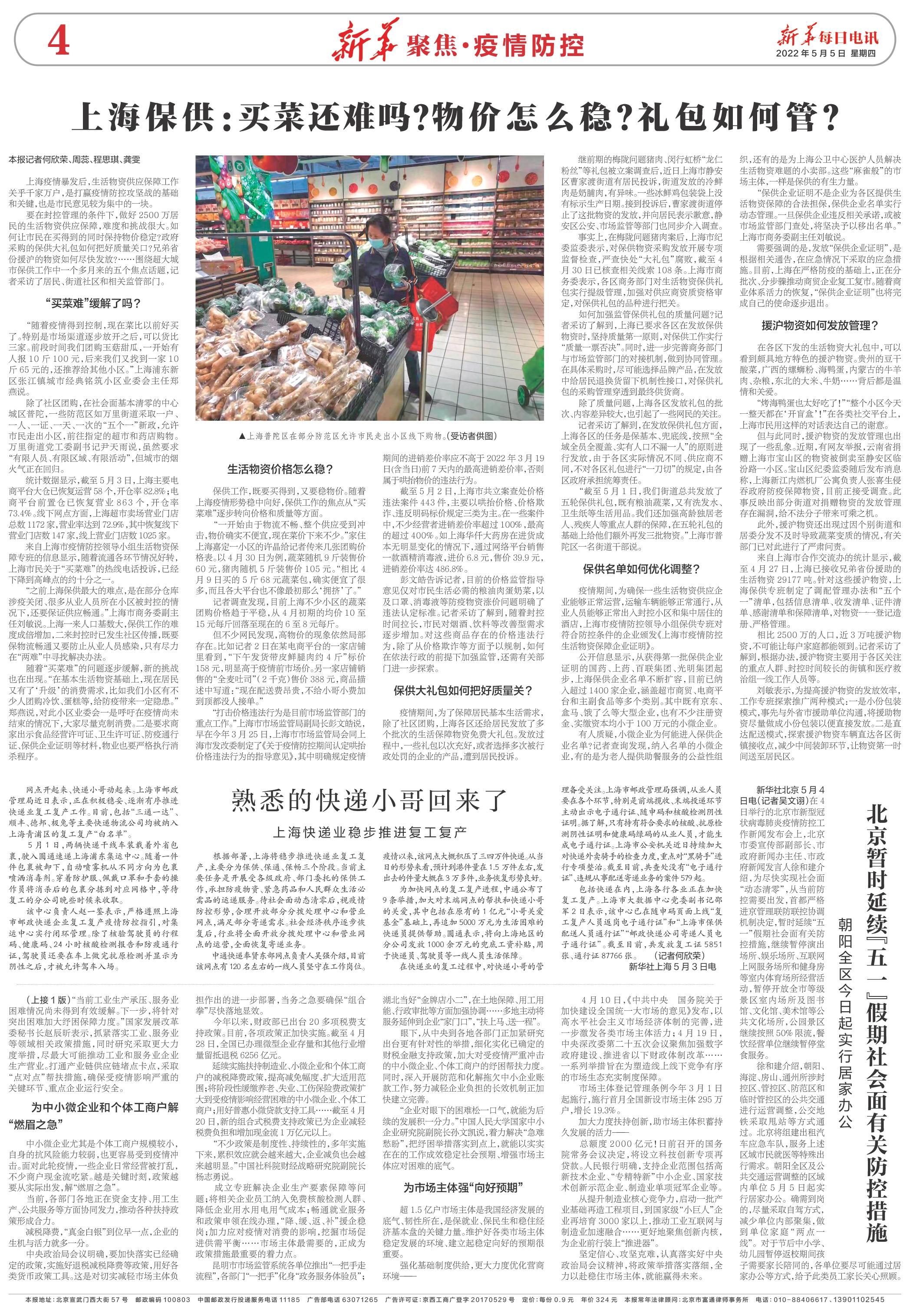 “截至5月1日,我们街道总共发放了五轮保供礼包,既有粮油蔬菜,又有洗发水、卫生纸等生活用品。我们还加强高龄独居老人、残疾人等重点人群的保障,在五轮礼包的基础上给他们额外再发三批物资。”上海市普陀区一名街道干部说。