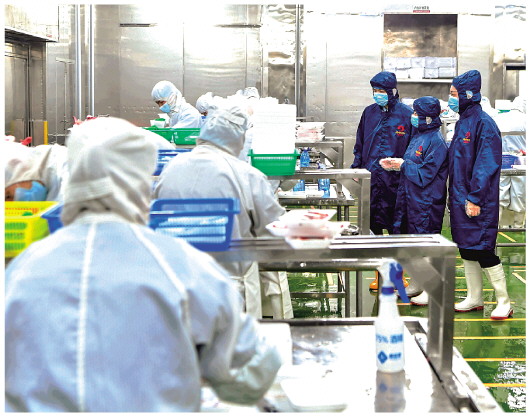 5月11日,在福州名成食品工业有限公司冷冻生产车间,国家税务总局福州经济技术开发区税务局工作人员在车间了解企业生产状况。
