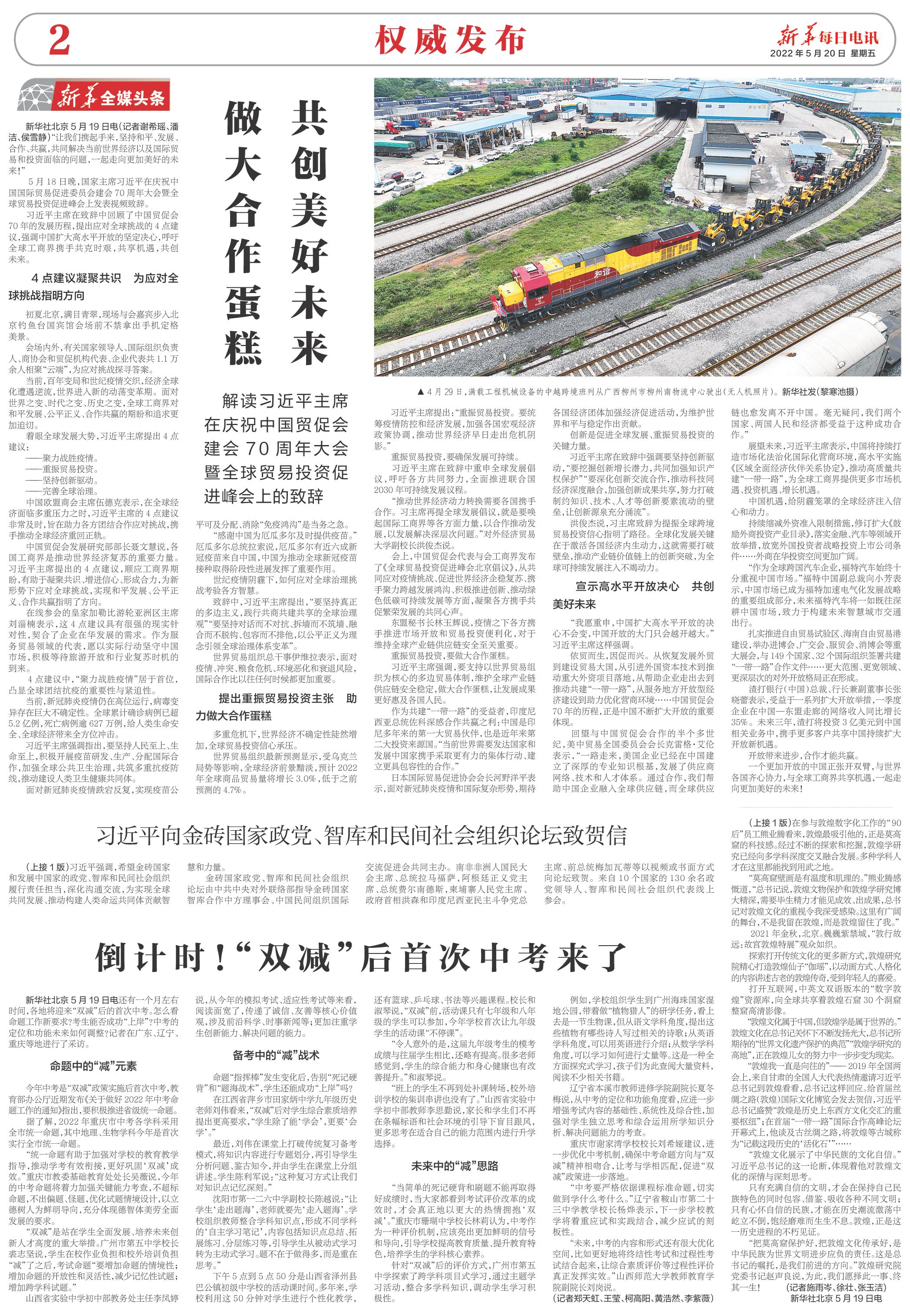 5月18日晚,国家主席习近平在庆祝中国国际贸易促进委员会建会70周年大会暨全球贸易投资促进峰会上发表视频致辞。