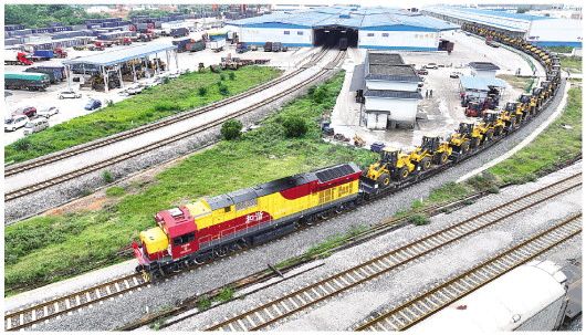 4月29日,满载工程机械设备的中越跨境班列从广西柳州市柳州南物流中心驶出(无人机照片)。新华社发(黎寒池摄)