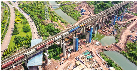 ▲5月23日,中缅新通道(重庆—临沧—缅甸)国际铁路班列从重庆果园港鱼嘴车站驶出,标志着中缅新通道(重庆—临沧—缅甸)正式开通。 新华社记者唐奕摄