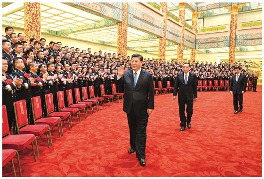 5月25日,党和国家领导人习近平、李克强、王沪宁等在人民大会堂会见全国公安系统英雄模范立功集体表彰大会代表。 新华社记者李学仁摄 |