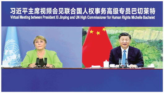 5月25日,国家主席习近平在北京以视频方式会见联合国人权事务高级专员巴切莱特。 新华社记者岳月伟摄 |