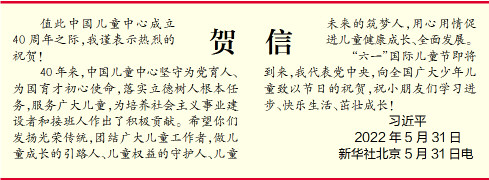 40年来,中国儿童中心坚守为党育人、为国育才初心使命,落实立德树人根本任务,服务广大儿童,为培养社会主义事业建设者和接班人作出了积极贡献。希望你们发扬光荣传统,团结广大儿童工作者,做儿童成长的引路人、儿童权益的守护人、儿童未来的筑梦人,用心用情促进儿童健康成长、全面发展。