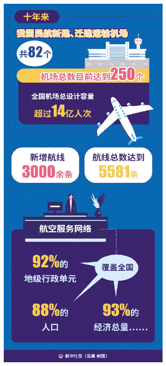 这十年,铁路、公路增加里程约110万公里;全国内河航道通航里程12.8万公里,拥有生产用码头泊位20867个;新建、迁建运输机场82个,机场总数达到250个;拥有邮政快递营业网点41.3万处……