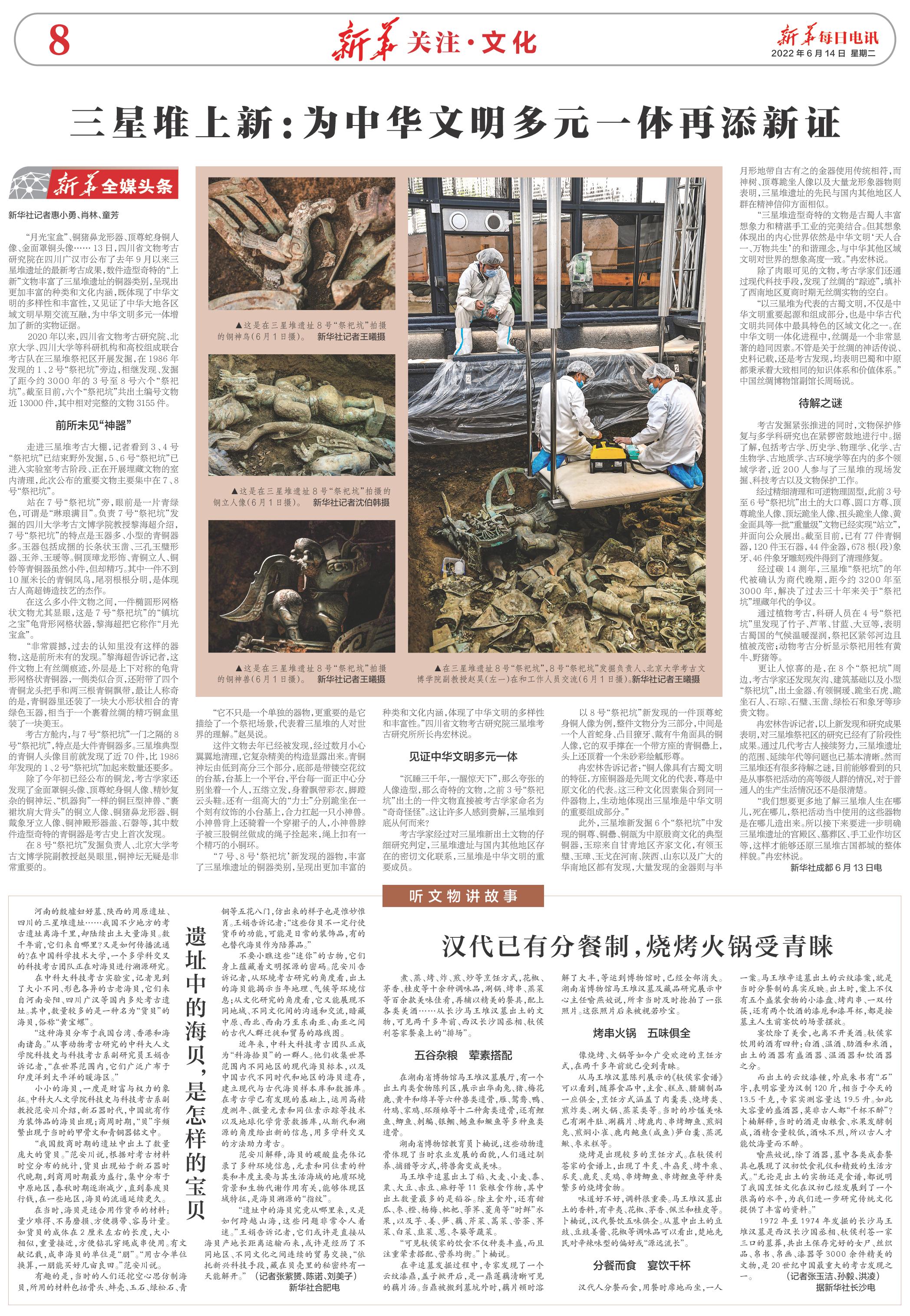 “月光宝盒”、铜猪鼻龙形器、顶尊蛇身铜人像、金面罩铜头像……13日,四川省文物考古研究院在四川广汉市公布了去年9月以来三星堆遗址的最新考古成果,数件造型奇特的“上新”文物丰富了三星堆遗址的铜器类别,呈现出更加丰富的种类和文化内涵,既体现了中华文明的多样性和丰富性,又见证了中华大地各区域文明早期交流互融,为中华文明多元一体增加了新的实物证据。