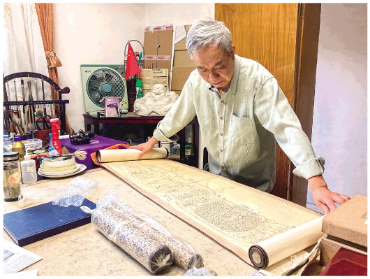 郭相颖为记者展示当年手绘的宝顶山摩崖造像图。 本报记者刘恩黎摄 |