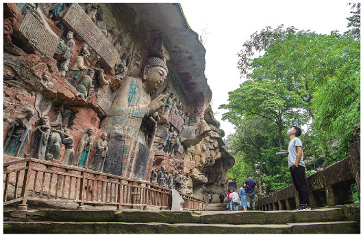 6月11日,游客在重庆大足石刻景区参观。 新华社记者唐奕摄 |