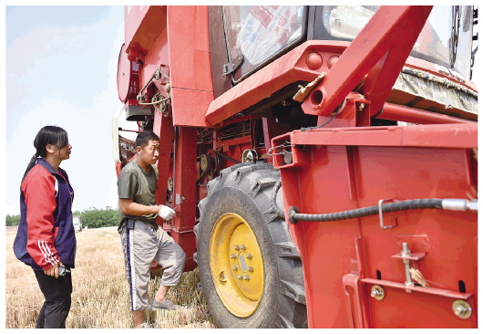 村民唐聚敏坐在收割机的驾驶室里,手里晃动着操纵杆。收割机在他的控制下前行、转弯、倒退,准确地将麦子收进去。不远处,妻子豆丽平正忙着统计地亩数、收费和联系业务。“虽然辛苦,但收入还是很可观的,每亩地60元的收割费,除去各项开支,一个麦收季能挣六七万元。”为农户们提供了方便的同时,唐聚敏、豆丽平这对“麦客”夫妻档也在追逐着自己的幸福梦。