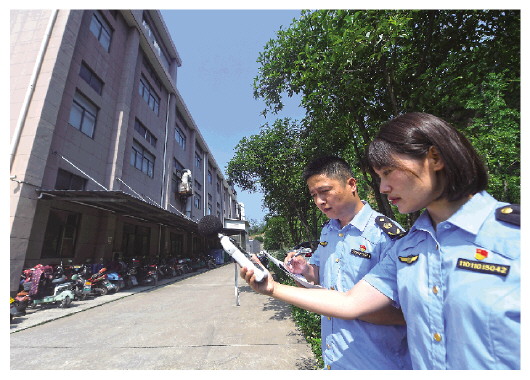 ▲6月14日,杭州市生态环境局临安分局的工作人员用专业设备在检测厂区的环境噪音。