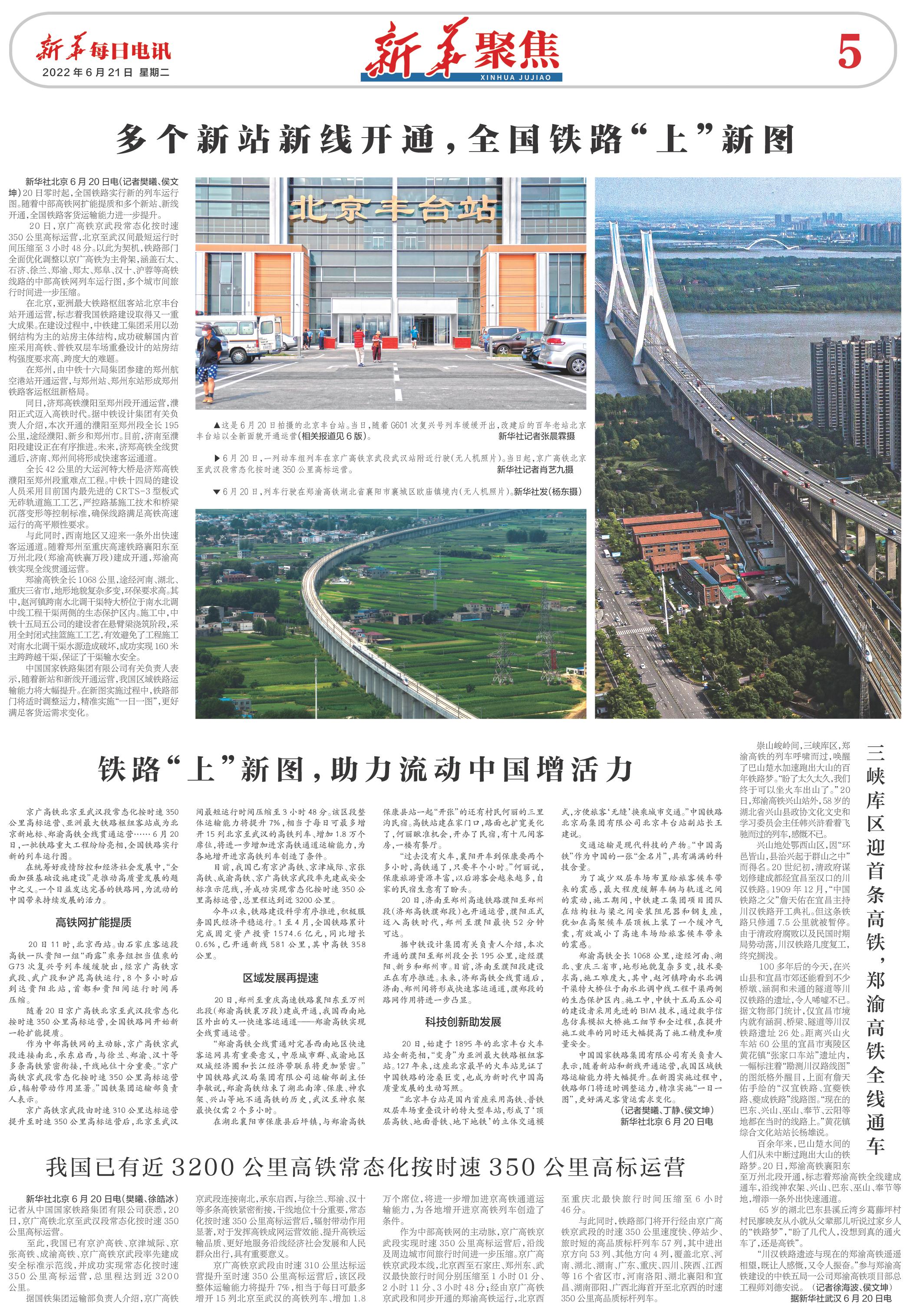 新华社北京6月20日电(记者樊曦、侯文坤)20日零时起,全国铁路实行新的列车运行图。随着中部高铁网扩能提质和多个新站、新线开通,全国铁路客货运输能力进一步提升。