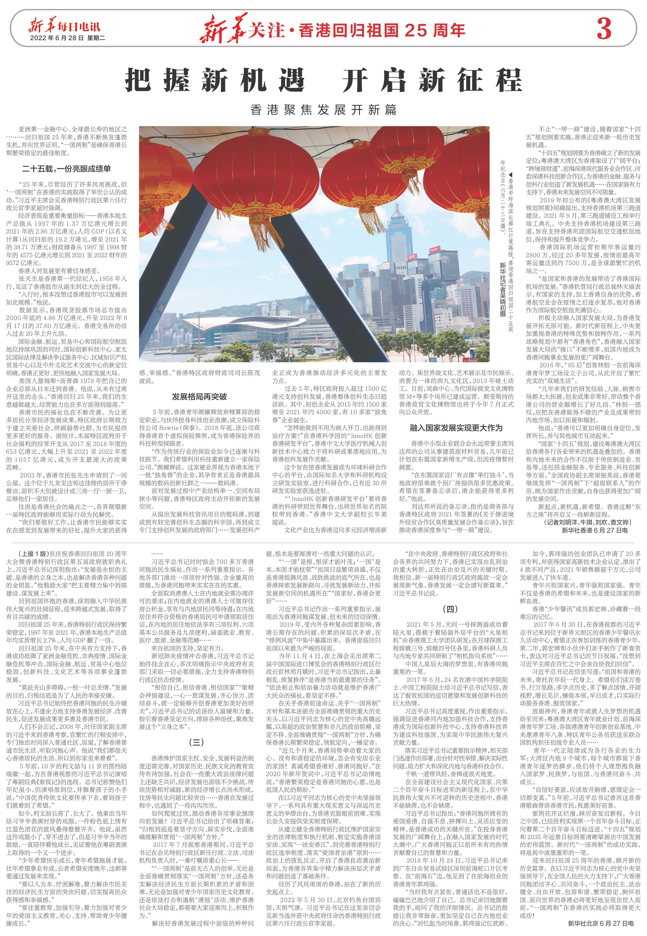 国际金融、航运、贸易中心和国际航空枢纽地位持续巩固的同时,国际创新科技中心、亚太区国际法律及解决争议服务中心、区域知识产权贸易中心以及中外文化艺术交流中心的新定位明确,香港正更好、更快地融入国家发展大局。