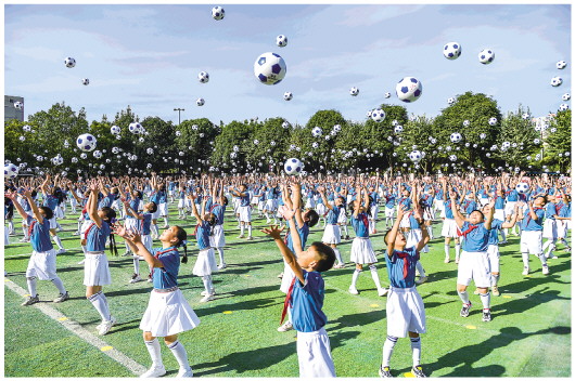 ▲2021年12月1日,小学生在广西南宁市滨湖路小学体育文化节开幕式上表演足球操。 新华社记者曹祎铭摄