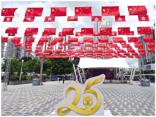 大街小巷国旗、区旗飘扬,中环码头行人天桥挂满大红灯笼,维港海面渔船浩荡巡游,新界居民架起传统大型花牌,“我和我的祖国,一刻也不能分割”的歌声在维园荡漾……回归祖国25周年纪念日来临之际,香港到处洋溢着喜庆氛围。
