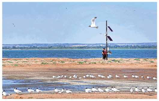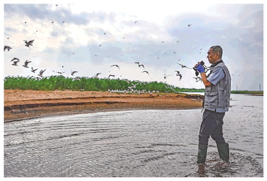 ▲陕西省动物研究所研究员肖红在红碱淖观察雏鸟(6月21日摄)。 |