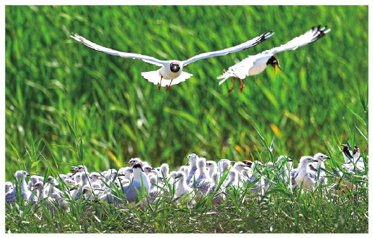 ▲红碱淖鸟岛上栖息的遗鸥成鸟和雏鸟(6月22日摄)。 |
