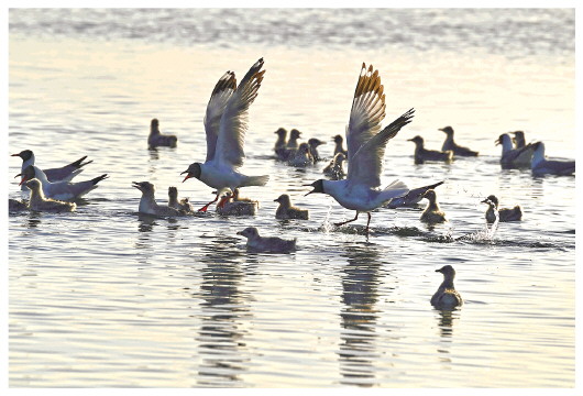 ▲几只遗鸥成鸟在训练雏鸟游泳(6月23日摄)。 |