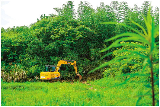 在湖南省醴陵市沈潭镇庞龙村,挖机在平整抛荒地,种粮大户朱建辉计划在这片抛荒地上开展大豆玉米带状复合种植(6月15日摄)。