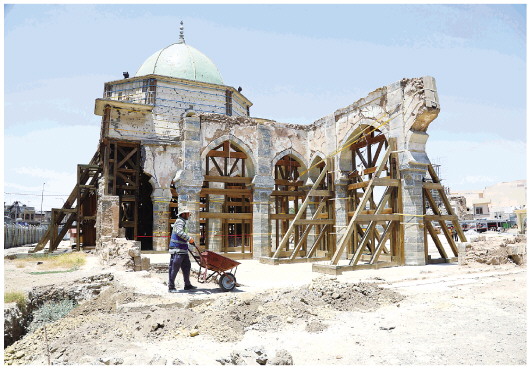 7月的摩苏尔最高气温超过45摄氏度,炎炎烈日下,工人们正对努里清真寺进行修复施工。5年前,溃败的“伊斯兰国”武装分子炸毁了这座拥有800多年历史的地标建筑。2018年伊拉克政府与联合国教科文组织和阿联酋政府签订协议,重建努里清真寺。