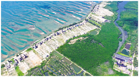 ▲文昌推动冯家湾一类生态红线区内养殖池塘、养殖场全部退出,并通过种植红树林等方式开展生态修复(2022年6月1日摄,无人机照片)。