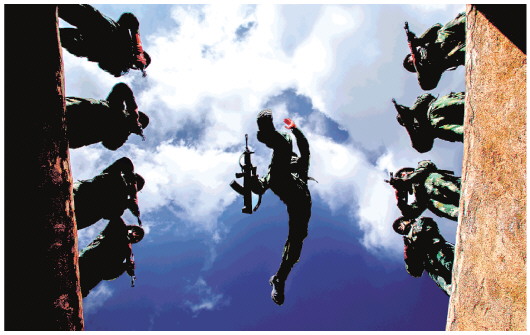 ▲8月1日,武警广西总队玉林支队某部不畏高温练兵备战,特战队员携枪通过壕沟。军人的节日有欢乐、有休整,更有坚守和奉献。八一建军节,解放军和武警部队官兵在各自战位上,以军人特有的方式庆祝中国人民解放军建军95周年。 新华社发(贾广华摄)