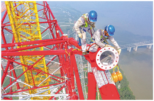 ▲8月1日,安徽送变电工程有限公司施工人员在池州长江大跨越南岸跨越塔封顶施工现场作业(无人机照片)。当日,经过建设者150余天的奋战,白鹤滩至浙江±800千伏特高压直流输电工程安徽池州长江大跨越高345米的南岸跨越塔成功封顶。白浙线是我国实施“西电东送”战略的重点工程,送端连接目前世界在建最大水电站白鹤滩水电站,受端位于杭州临平区浙北换流站,线路全长2140.2公里。 新华社发(郑贤列摄)