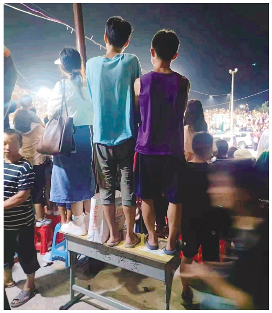等到比赛开打,球场内人山人海、座无虚席,球场外的山坡上、屋顶上,只要能站住脚的地方都是观众,“乡里的梯子都卖空了”,村民笑着说。