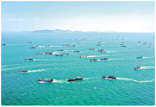 ▲8月16日,福建省福州市连江县黄岐中心渔港开渔出海的渔船在海面航行(无人机照片)。当日12时,福建省部分海域(北纬26度30分以南的福建海域)结束为期三个半月的伏季休渔期,渔民开始出海作业。在福建省福州市连江县海域,近千艘渔轮分别从黄岐、苔菉两个中心渔港驶向东海。 新华社记者姜克红摄