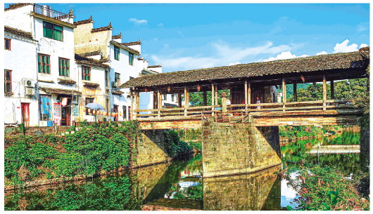 村人有诗云:“两岸芳洲过行客,桥梁千古卧长虹。”廊桥建于明景泰年间,名称“通济桥”,含通达四方、利济万民之意,已有五百多年历史。