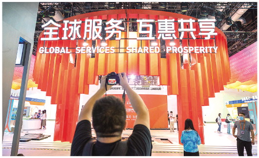 8月28日,在国家会议中心,记者在服贸会媒体探营活动中拍摄照片。2022年中国国际服务贸易交易会将于8月31日至9月5日在位于北京的国家会议中心和首钢园区举办。 新华社记者才扬摄