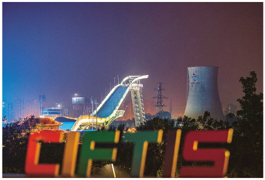 这是8月29日在服贸会媒体探营活动中拍摄的首钢园区夜景。2022年中国国际服务贸易交易会将于8月31日至9月5日在位于北京的国家会议中心和首钢园区举办。 新华社记者郝昭摄