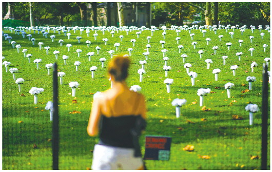 二〇二一年十月七日,一名女子在美国纽约炮台公园内为悼念枪支暴力遇难者摆放的白色瓶花前驻足。