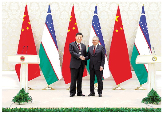 习近平致答辞。习近平指出,米尔济约耶夫总统向我授予“最高友谊”勋章,充分体现出乌方对中乌关系的高度重视,以及乌兹别克斯坦人民对中国人民的深情厚谊。乌兹别克斯坦著名诗人纳沃伊说:“没有比生活在友谊之中更美好的事情。”早在两千多年前,中乌两个伟大民族就以丝绸之路为纽带,互通有无、互学互鉴。30年前,中乌建交,开启了两国人民友好新篇章。两国全面战略伙伴关系实现跨越式发展,各领域合作取得丰硕成果,有力促进了各自发展振兴,也为维护中亚地区乃至世界和平稳定注入了正能量。我和米尔济约耶夫总统商定,深化新时代中乌全面战略伙伴关系,致力于践行中乌命运共同体。中方愿同乌方一道努力,谱写中乌友好新篇章。