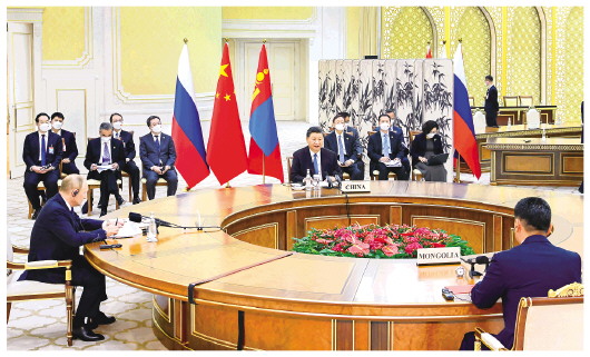 普京表示,俄中蒙三方合作成效显著,具有明显互利性质,为彼此关系发展增加了附加值。三国作为近邻,应该相互理解、相互支持,全面巩固推进三方合作。应鼓励支持三国企业家加强交流合作,推动交通、物流、跨境运输、能源、高新技术、旅游、人文等领域合作取得更多实质进展。