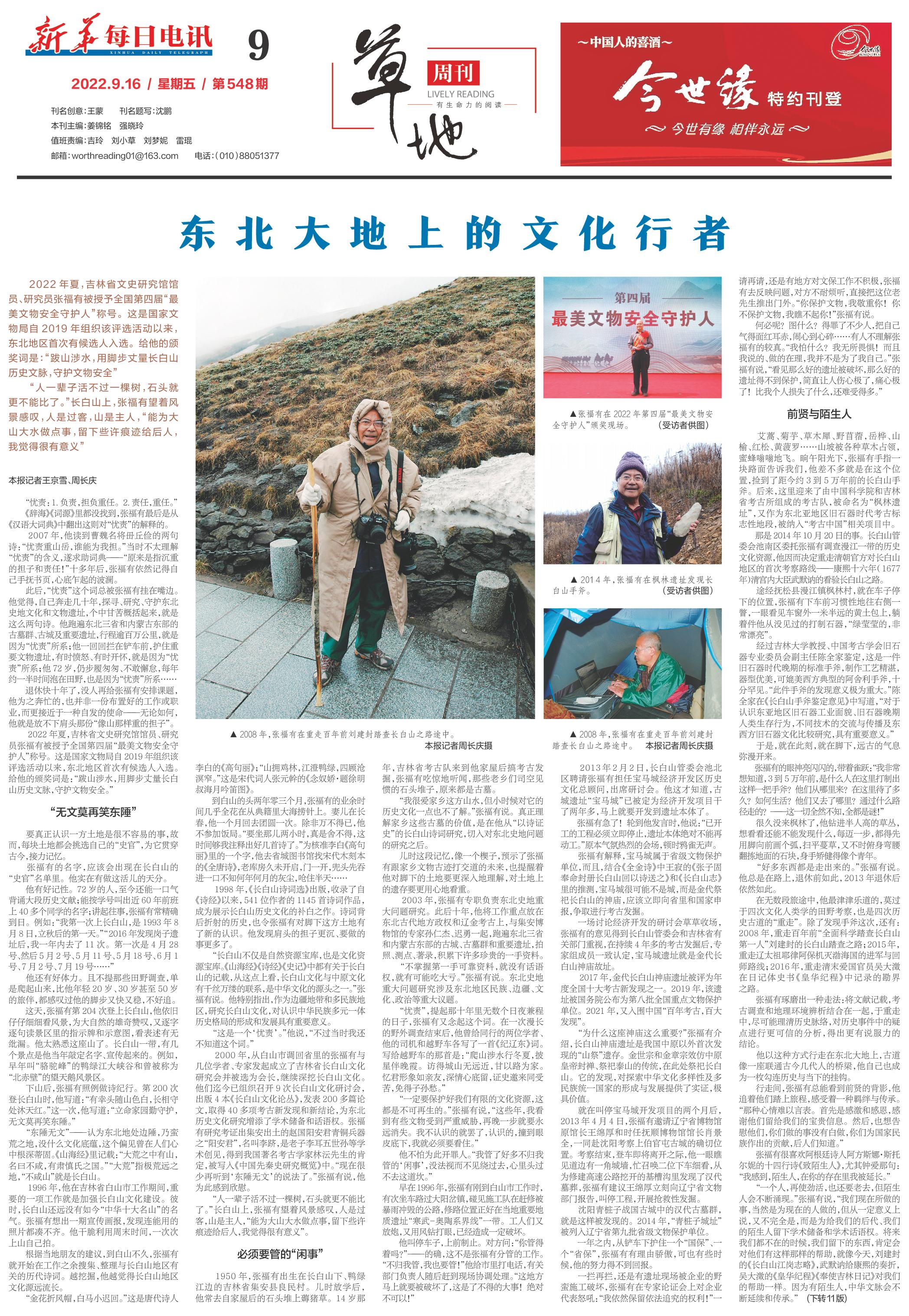 2022年夏,吉林省文史研究馆馆员、研究员张福有被授予全国第四届“最美文物安全守护人”称号。这是国家文物局自2019年组织该评选活动以来,东北地区首次有候选人入选。给他的颁奖词是:“跋山涉水,用脚步丈量长白山历史文脉,守护文物安全。”