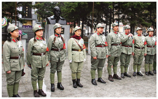 2008年4月2日,东北抗联精神宣传队员在抗日民族英雄李兆麟将军墓前演唱抗联歌曲。 新华社资料片 |