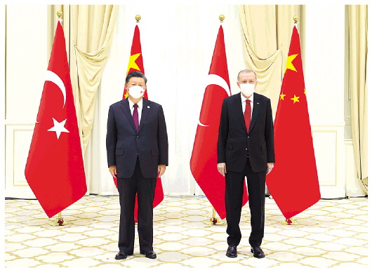 ▲当地时间9月16日上午,国家主席习近平在撒马尔罕国宾馆会见土耳其总统埃尔多安。