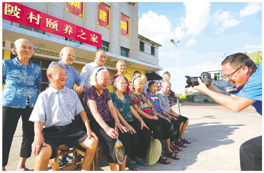 青年志愿者在为江西省新余市分宜县杨桥镇建陂村“颐养之家”的老人们拍摄全家福(9月14日摄)。