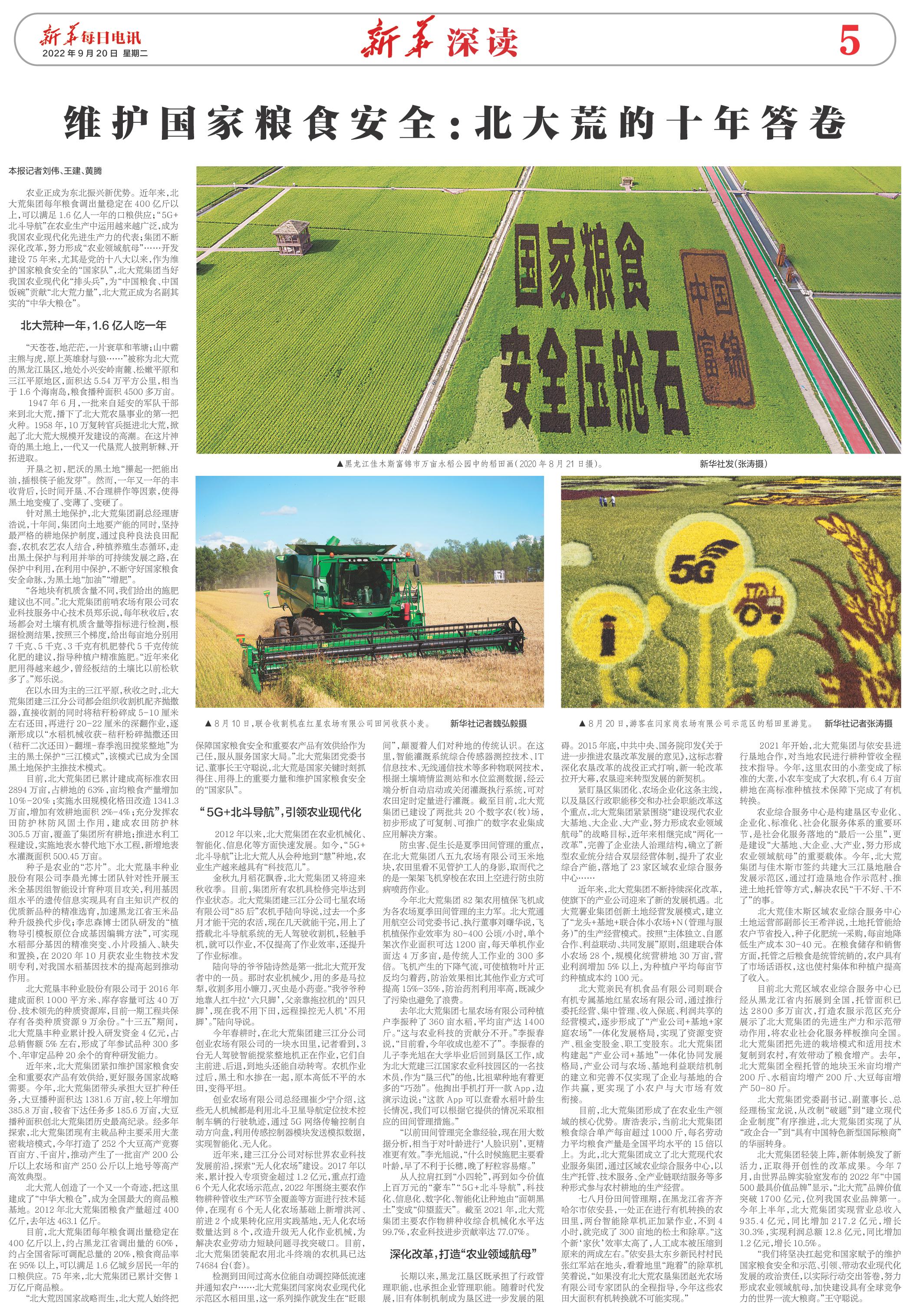 农业正成为东北振兴新优势。近年来,北大荒集团每年粮食调出量稳定在400亿斤以上,可以满足1.6亿人一年的口粮供应;“5G+北斗导航”在农业生产中运用越来越广泛,成为我国农业现代化先进生产力的代表;集团不断深化改革,努力形成“农业领域航母”……开发建设75年来,尤其是党的十八大以来,作为维护国家粮食安全的“国家队”,北大荒集团当好我国农业现代化“排头兵”,为“中国粮食、中国饭碗”贡献“北大荒力量”,北大荒正成为名副其实的“中华大粮仓”。