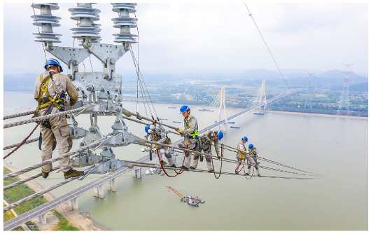 在安徽池州长江边,施工人员在三百多米高空进行跨江作业(九月十五日摄)。九月十六日,白鹤滩至浙江特高压直流输电工程安徽段顺利完成长江大跨越放线作业。十年来,我国交通、能源、水利和新型基础设施发展取得了历史性成就,现代综合立体交通运输体系、现代能源体系加快构建,基础设施整体水平实现跨越式提升。新华社发(赵献富摄) |