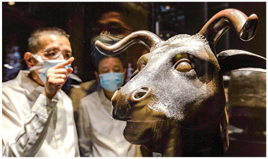 9月26日,观众在观看展出的牛首。新华社记者王翔摄