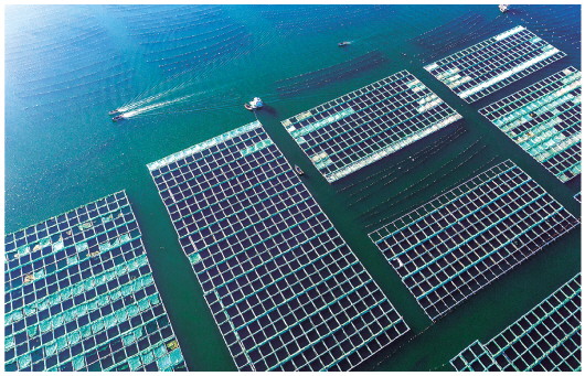 ▲9月26日,养殖工人在山东省荣成市桑沟湾海上养殖区作业(无人机照片)。连日来,在山东省荣成市桑沟湾海洋牧场,养殖工人驾驶养殖船进行秋管作业,一派繁忙景象。 新华社发(王福东摄)