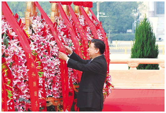 9月30日上午,党和国家领导人习近平、李克强、栗战书、汪洋、王沪宁、赵乐际、韩正、王岐山等来到北京天安门广场,出席烈士纪念日向人民英雄敬献花篮仪式。这是习近平整理花篮上的缎带。